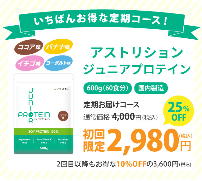 粉末状大豆たんぱく(国内製造)、ドロマイト(カルシウム・マグネシウム含有)、マルトデキストリン、バナナパウダー、粉末油脂、亜鉛酵母、ビタミンE含有植物油、食塩/骨カルシウム、増粘多糖類、プルラン、ビタミンC、甘味料(ステビア)、乳化剤(大豆由来)、ピロリン酸鉄、加工デンプン、香料、ナイアシン、パントテン酸Ca、ビタミンB6、ビタミンB1、ビタミンB2、葉酸、ビタミンD、ビタミンB12