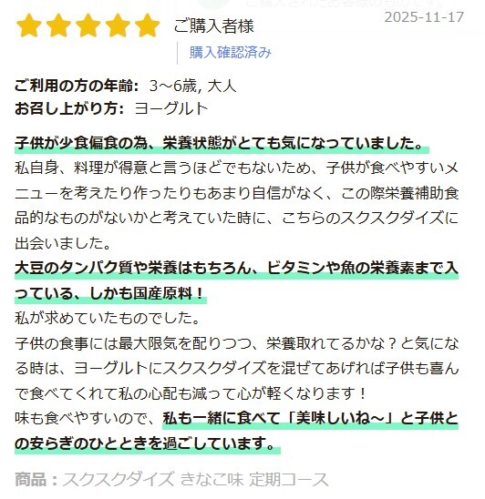 A.スクスクダイズは医薬品ではなく食品のため明確な摂取量はありませんが、1日1~2食を目安にお召し上がりください。
