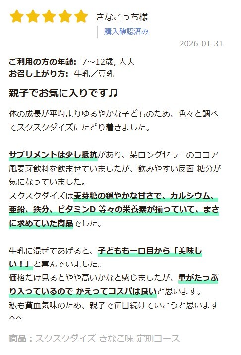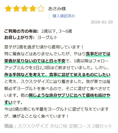 A.スクスクダイズは鉄分として非ヘム鉄を配合しており、鉄分の吸収をよくするビタミンCも配合しております。鉄分は摂りすぎると過剰摂取になるおそれがあり、サプリで摂るには注意が必要な栄養素です。非ヘム鉄は「鉄不足の状態では吸収率が上がる」という性質があることから、不足している子供には鉄分がしっかりとれて、不足していない子供には適度に補助ができるため、非ヘム鉄とビタミンCの組み合わせを採用しています。