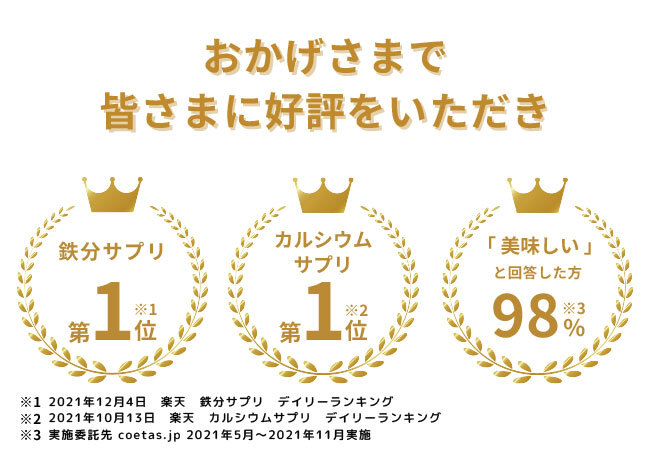 A.スクスクダイズは鉄分として非ヘム鉄を配合しており、鉄分の吸収をよくするビタミンCも配合しております。鉄分は摂りすぎると過剰摂取になるおそれがあり、サプリで摂るには注意が必要な栄養素です。非ヘム鉄は「鉄不足の状態では吸収率が上がる」という性質があることから、不足している子供には鉄分がしっかりとれて、不足していない子供には適度に補助ができるため、非ヘム鉄とビタミンCの組み合わせを採用しています。
